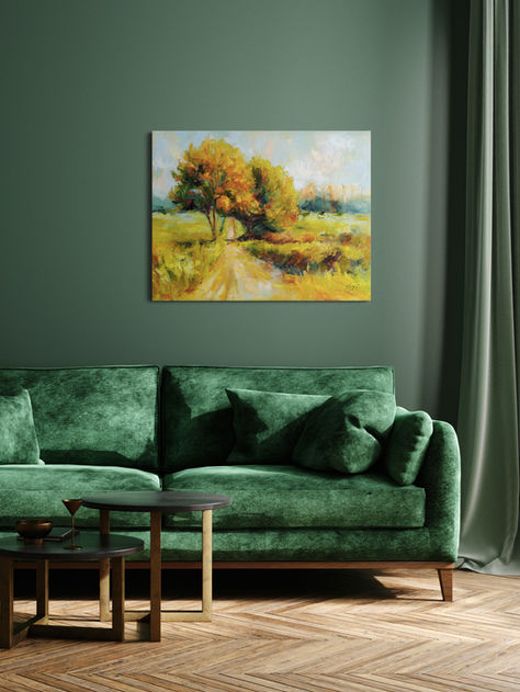 Step into a tranquil countryside scene where a winding road leads to a cozy cottage nestled amidst vibrant autumn trees. This oil painting captures the harmony of nature with its rich golden hues, soft greens, and radiant skies. Each brushstroke brings the peaceful charm of rural life into your space, inviting you to pause and dream of simpler times.